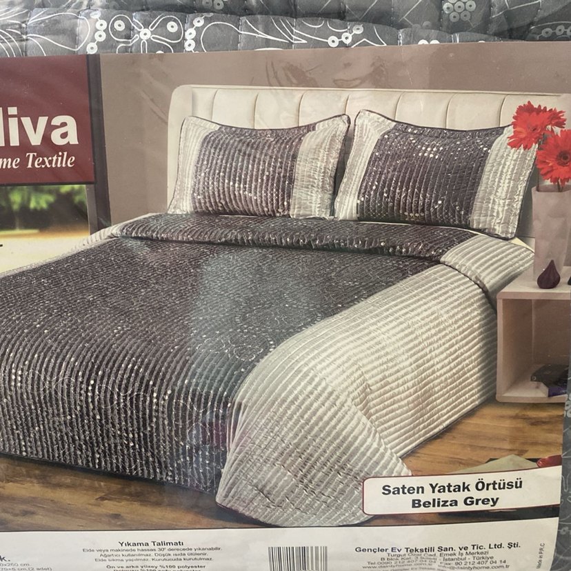 Beliza gri saten yatak örtüsü, işlemeli desenleri ve yumuşak dokusuyla konfor sağlar. Uyumu için yastık kılıfları dahildir. ️