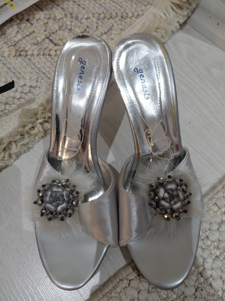 İşlemeli çiçek detayları ve tüylü süslemeleriyle gri, saten görünümlü dolgu topuklu terlikler, şık ve klasik bir düğün tercihi.
