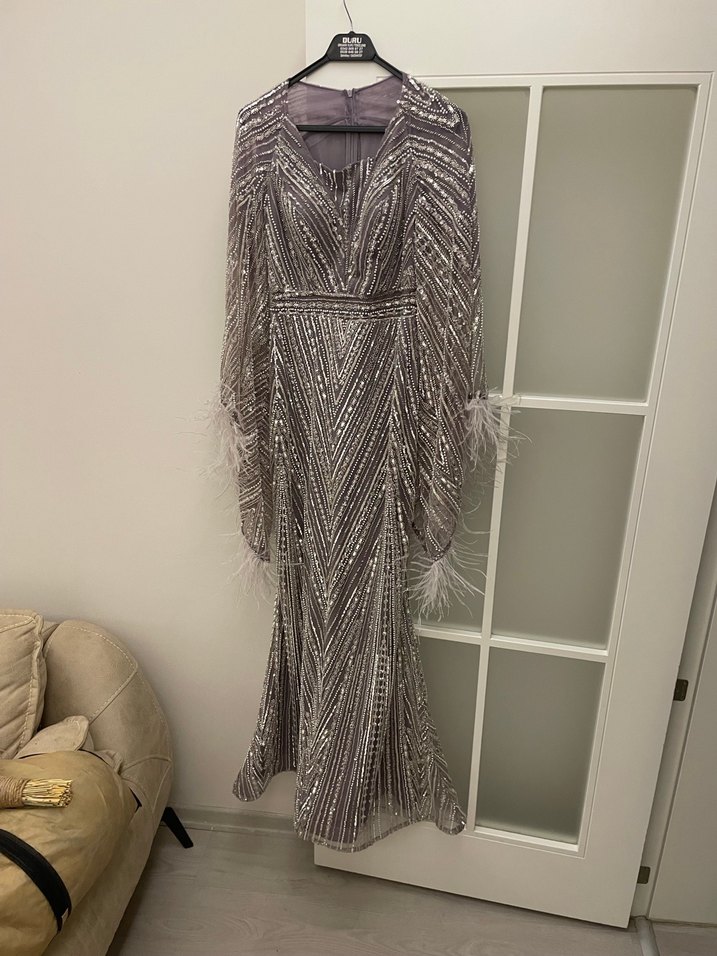 Gri işlemeli, V yaka ve uzun kollu, drapeli detaylara sahip uzun abiye elbise. Düğünler için uygun. ✨ 1 defa kullanıldı bi kaç saat fiyat da yardımcı olunur çiçeği ile birlikte