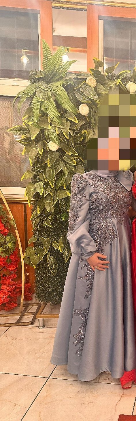 Bu gri işlemeli uzun abiye elbise, yüksek yakalı ve uzun kolludur. Drapeli tasarımı ile şıklık katıyor, düğünler için uygundur.