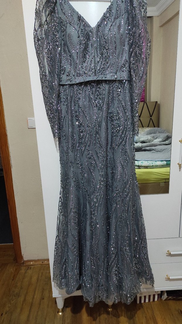 Gri renkli, işlemeli uzun abiye elbise. Drapeli detaylar, tekne yaka ve uzun kollu tasarımıyla düğünler için uygun klasik şıklık sunar. 59 kiloyken ben giydim 59 -65 kilo arası olur ✨ tekliflere açığız