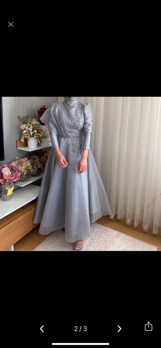Gri renkli, işlemeli ve drapeli detaylara sahip, uzun ve bol kesim kadın abiye elbise. Yüksek yakalı ve uzun kolludur, düğünler için uygundur. 36-38 beden içindir
