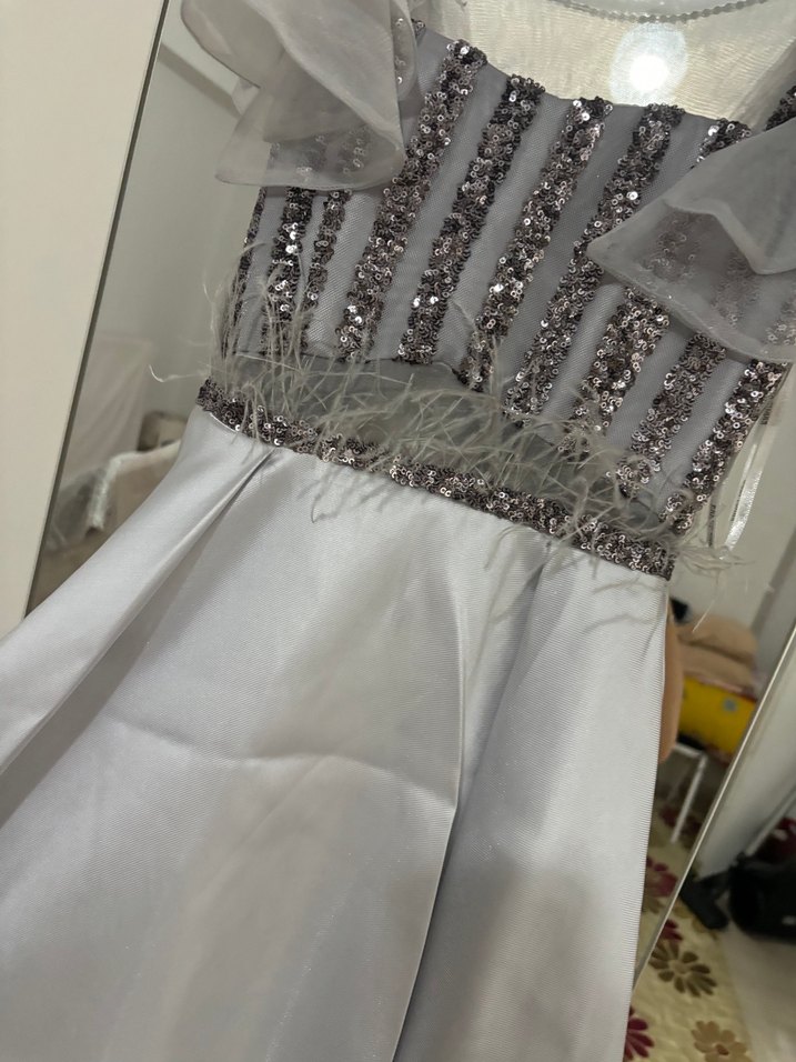 Gri, işlemeli, uzun ve bohem tarzda, balıkçı yaka ve kolsuz, oturan kesim nişan elbisesi. Fırfır detaylarıyla şık ve göz alıcı. 1 kez giyildi 8,9 yaş temiz