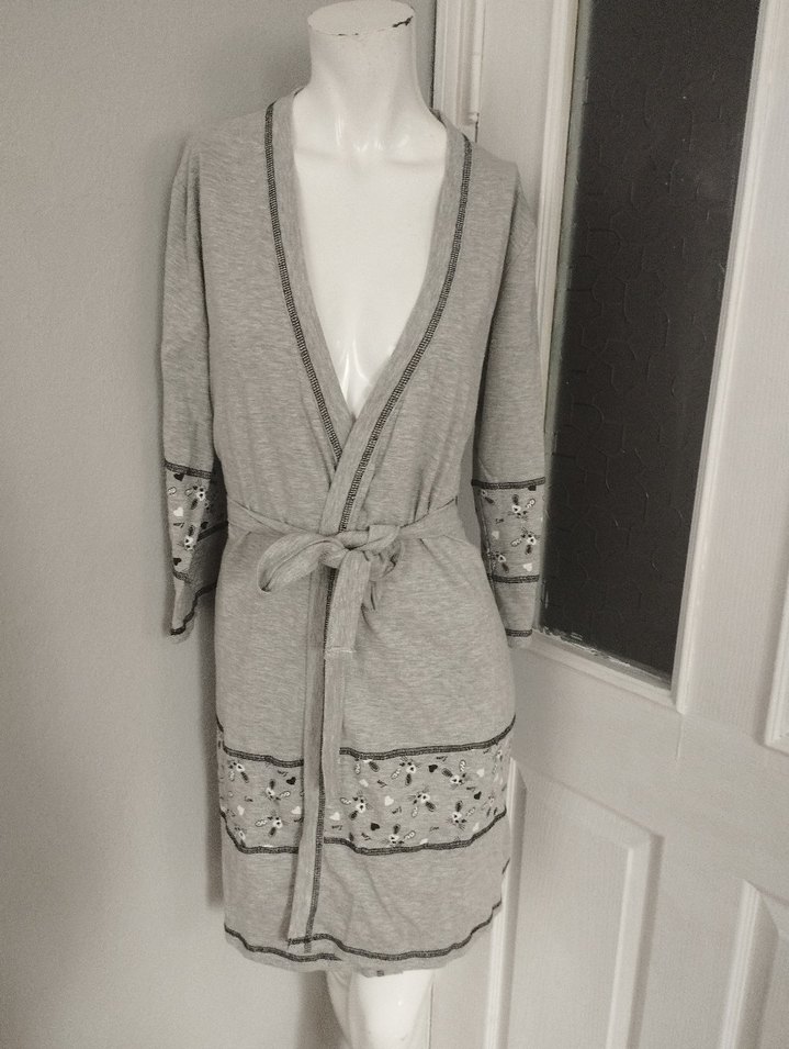 Gri renkli, uzun ve bol kesim kadın sabahlık, uzun kollu ve işlemeli manşetlere sahip, rahat ve bohem tarzda.90 cm boyunda