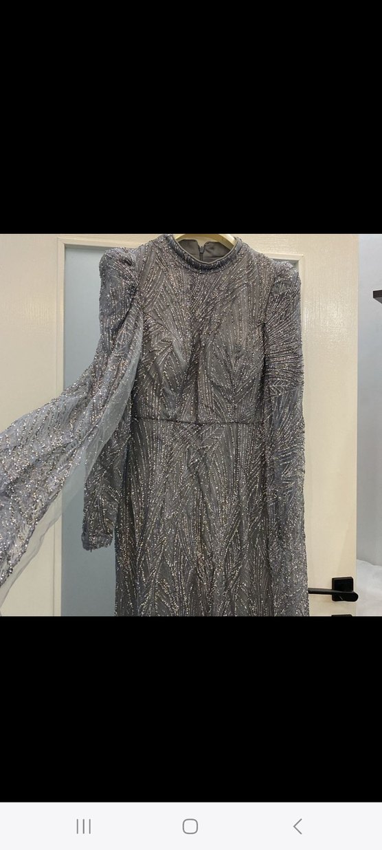 Gri İşlemeli Uzun Kollu Abiye Elbise