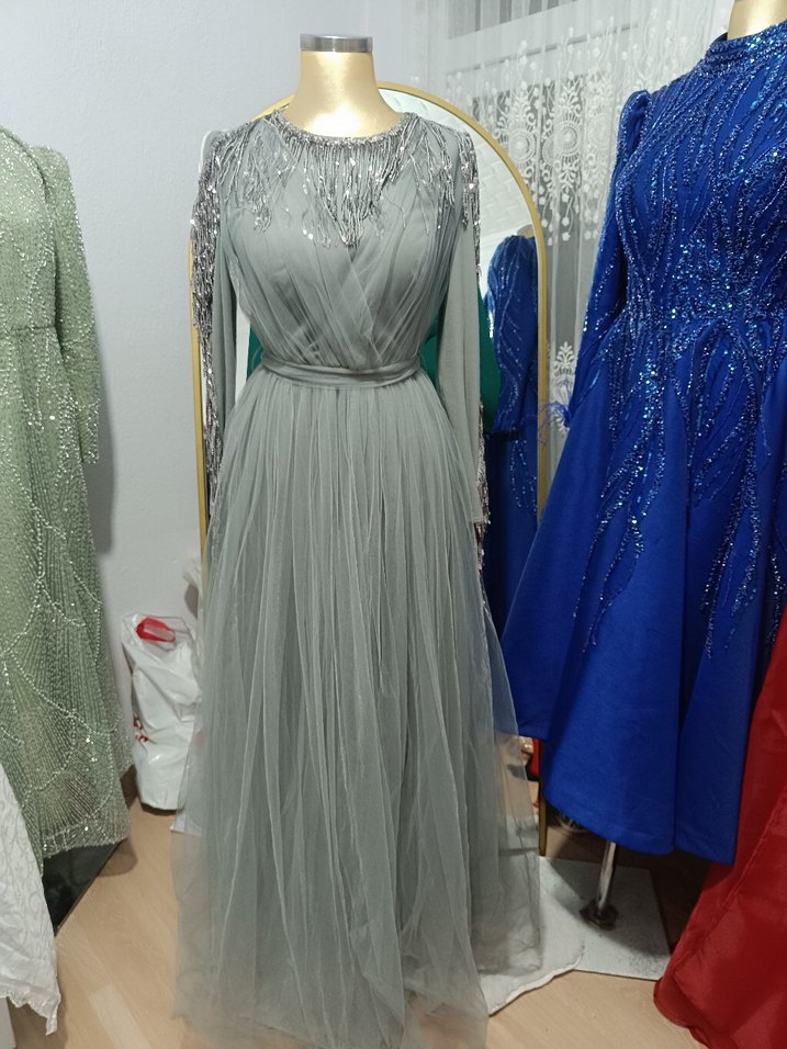 Gri İşlemeli Uzun Kollu Abiye Elbise Satılık
