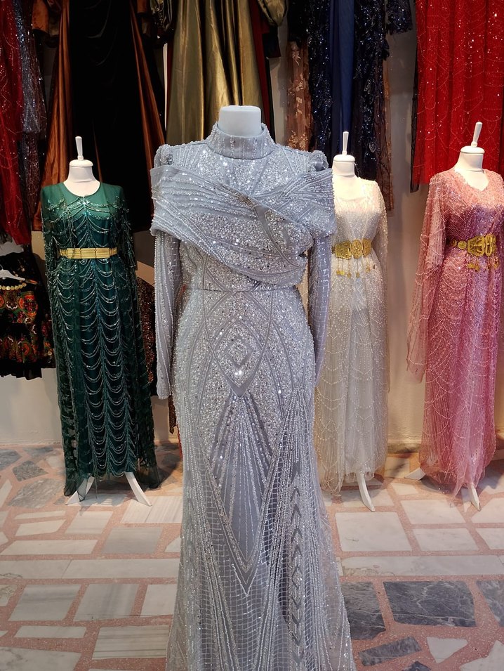 Gri renkte, yüksek yakalı ve uzun kollu, işlemeli detaylara sahip drapeli uzun abiye elbise. Bohem tarzda, düğünler için uygun, regular fit.