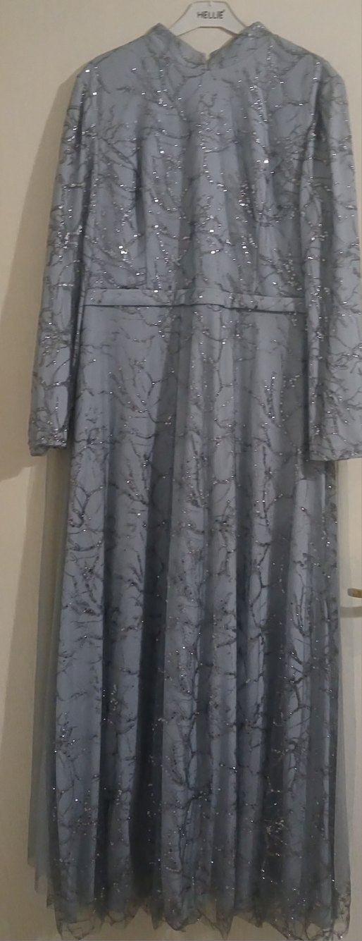 Gri renkte, uzun kollu ve dökümlü kesime sahip kadın abiye elbise. İşlemeli desenleri ve kayık yaka ile klasik gotik şıklığı yansıtır.