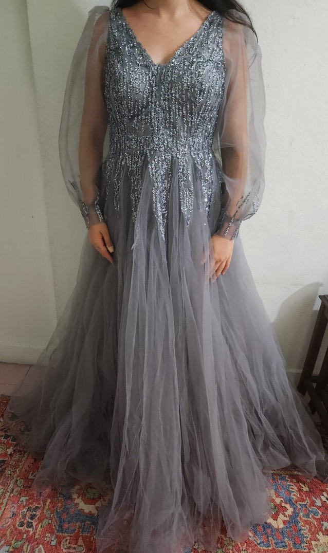 Uzun kollu, V yakalı ve işlemeli detaylara sahip, şık ve drapeli gri nişan elbisesi. Bohem tarzda, klasik ve göz alıcı bir seçim.