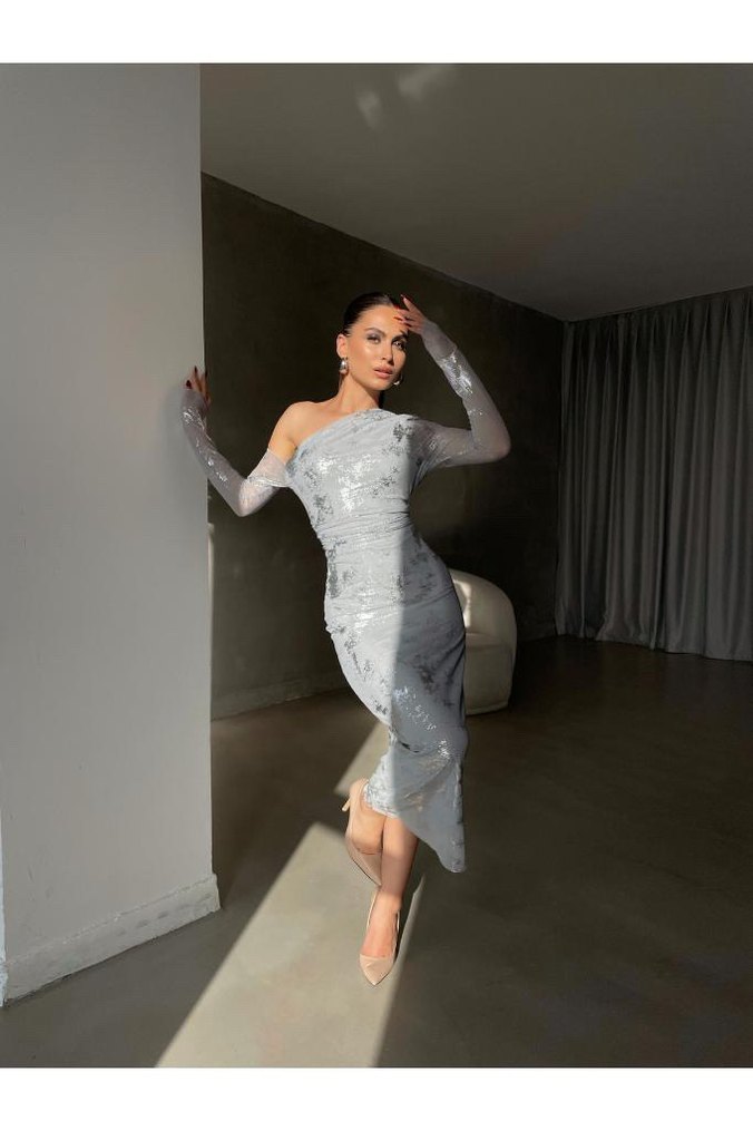 Gri, işlemeli uzun abiye elbise, straplez yaka ve transparan askılı kollarıyla şık bir görünüm sunar. Parti için uygundur. ✨ etiketi üstünde