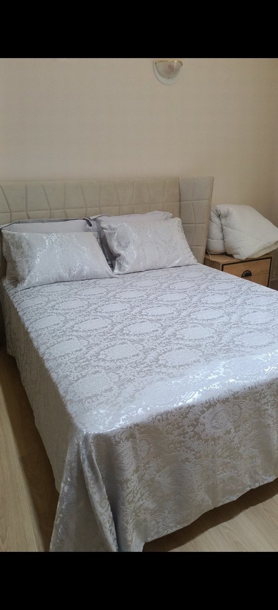 Gri işlemeli desenlere sahip ve uyumlu yastık kılıfları ile yatağı kaplar. Yatak odasına zarif bir dokunuş katar. ️