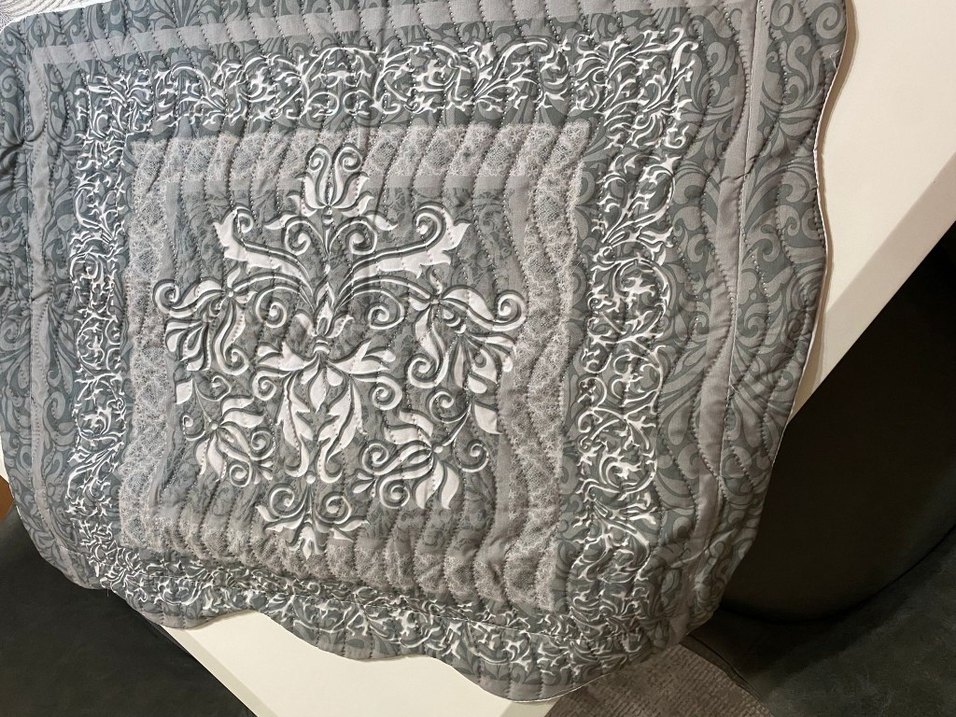 Gri işlemeli desenlere sahip yatak örtüsü, kumaşa doku ve zarafet katıyor.