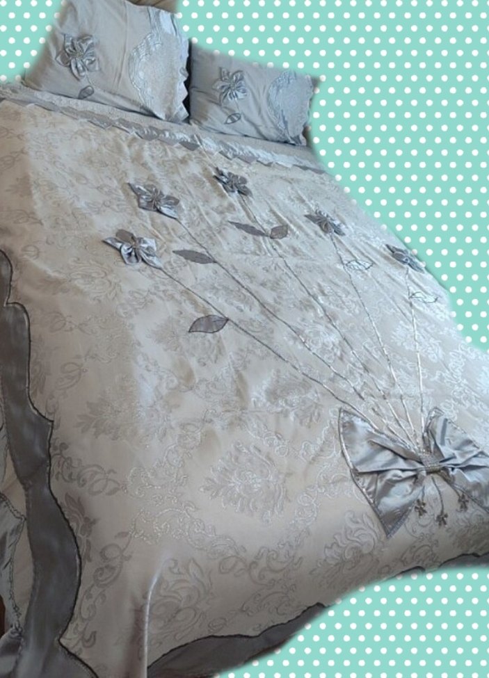 Gri renkli yatak örtüsü, işlemeli çiçek desenleri ve yumuşak dokusuyla yatak odasına zarif bir dokunuş katar. yastık ve pike