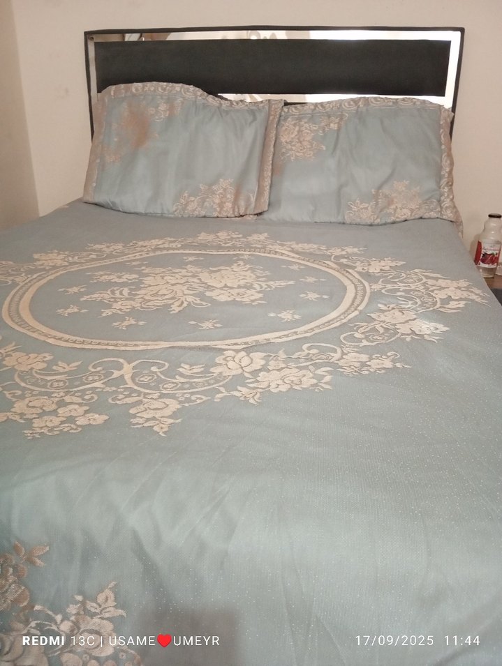Gri renkli yatak örtüsü, çiçek işlemeleriyle zarif bir görünüm sunar. Takım, uyumlu yastık kılıflarını içerir. ️