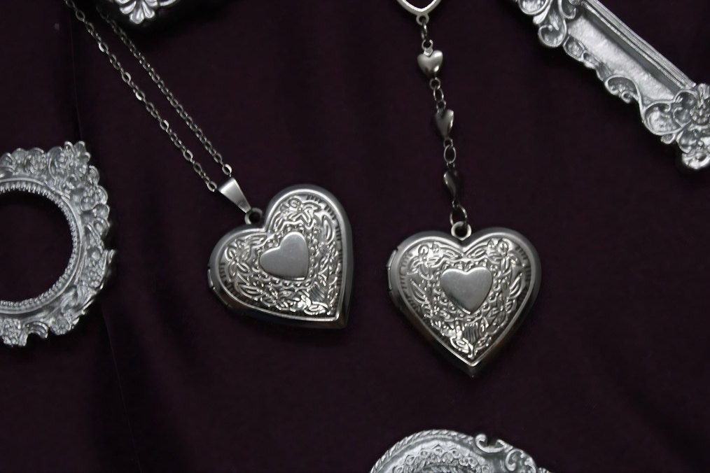 Gri işlemeli kalp figürlü, zincir detaylı gotik kolye. Midi uzunlukta, romantik akşamlar için uygun bir tasarım.