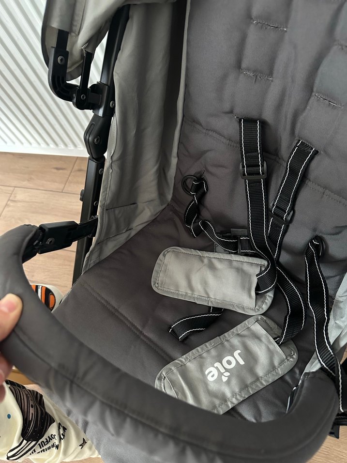 Gri renkli Joie bebek arabası, konforlu oturma alanı ve güvenli emniyet kemeri ile donatılmıştır. Dışarıda kullanım için uygundur.