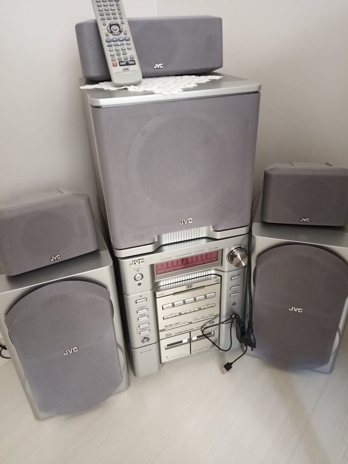 Gri JVC müzik sistemi, çoklu kontrol paneli ve beş uyumlu hoparlör içerir. Uzaktan kumanda ve kulaklık girişi ile kullanım kolaylığı sağlar.kaset arizalndi aux sağlam bulutut hediyem telden bağlanabiliyor DVD sağlam MP3 çalmaz 18 lik sidi kumadna sağlam kurcalanmamis cihaz kırık yok çizik olabilir oda normal