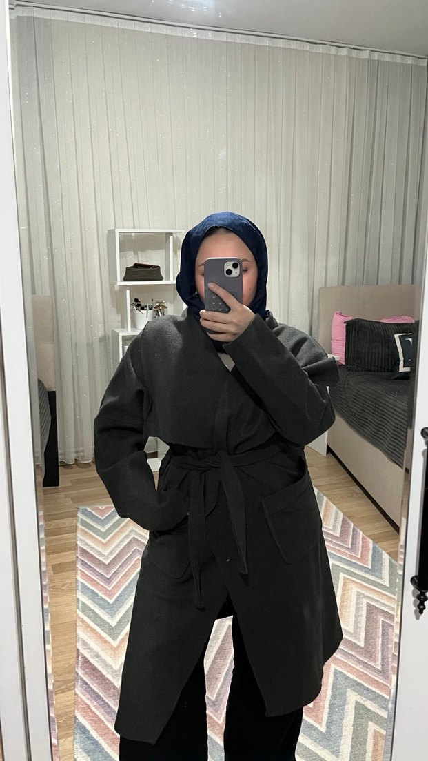Gri midi kaban, yüksek yakalı ve uzun kolludur. Yumuşak ve sıcak kumaştan, bol kesim ve kuşaklıdır, günlük kullanıma uygundur. Astarsız kaşe Standart beden