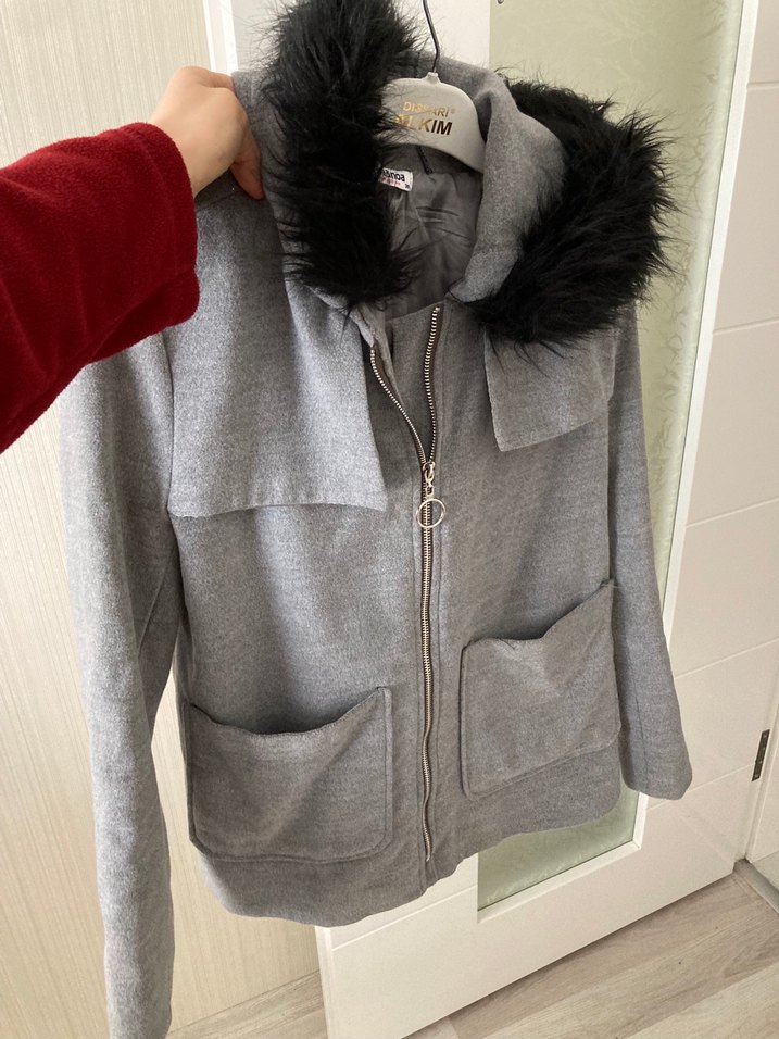 Gri renkte, kürklü yakası ve uzun kollu, fit kesim kadın ceket. Yumuşak ve sıcak dokusuyla midi boyda, sokak stiline uygun rahat bir modeldir.