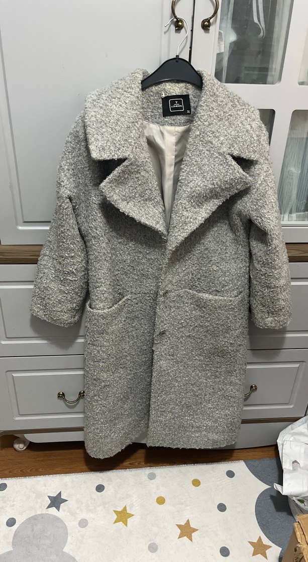 Geniş yakalı, yumuşak dokulu gri kaban, önünde iki cep bulunur ve soğuk havalar için uygundur. İki çıtcıtı dikilecek sadece.