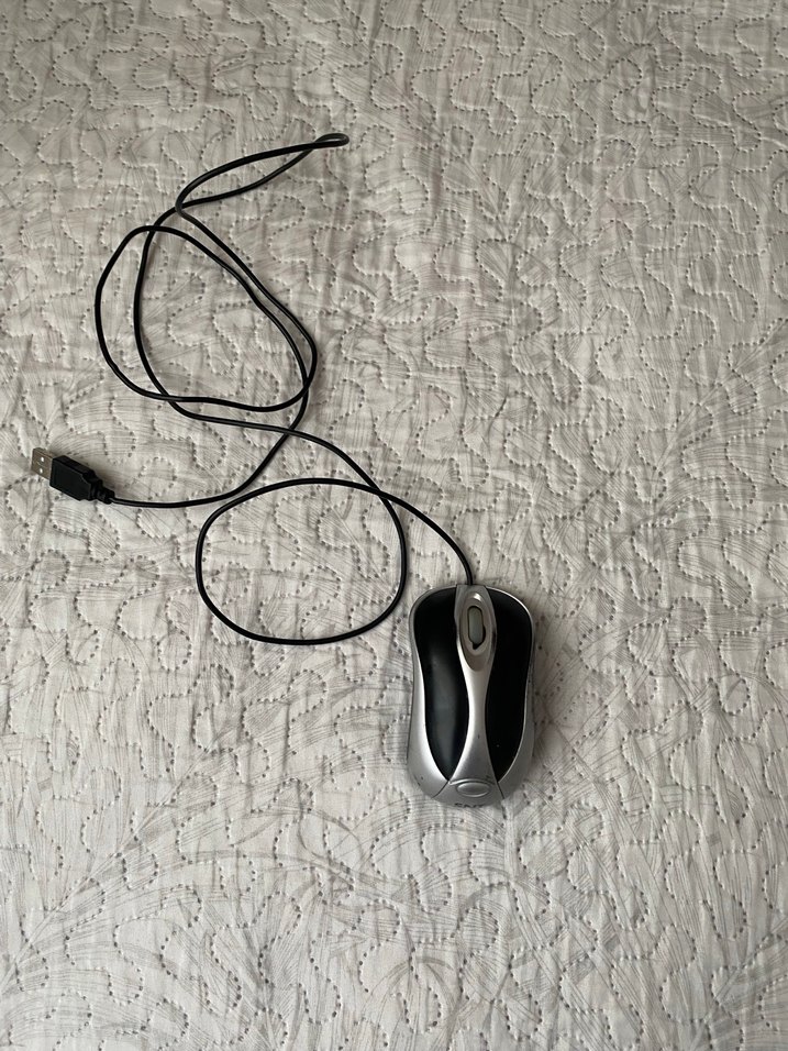 Gri renkte, kablolu ve ergonomik tasarıma sahip bilgisayar mouse'u. ️