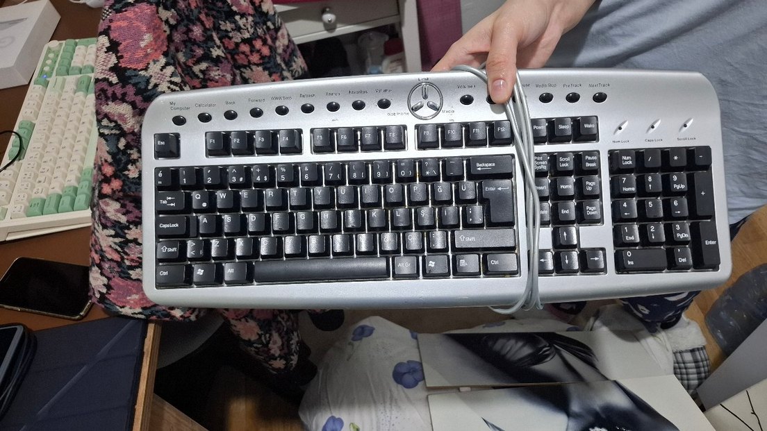 Standart tuşlara ve üstte ek fonksiyon tuşlarına sahip gri kablolu klavye. Masaüstü kullanım için uygundur. ⌨️