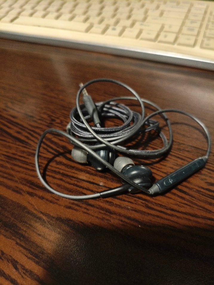 Yumuşak uçlu ve kablolu gri kulak içi kulaklık, çağrılar için mikrofonlu. Rahat kullanım ve net ses sağlar.