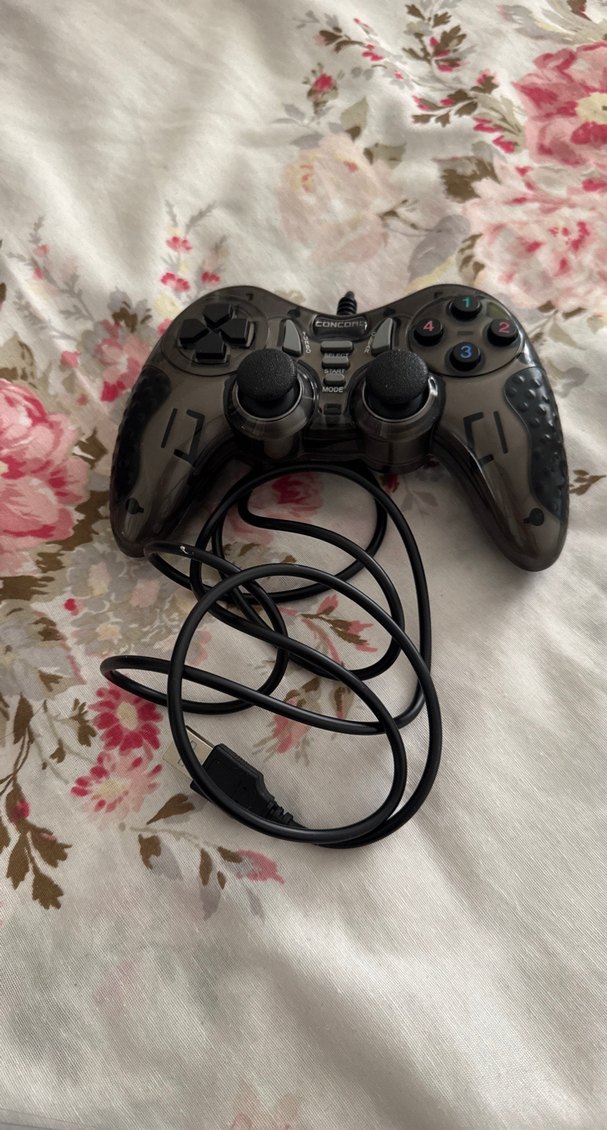 Çift analog çubuklu ve çoklu butonlu gri kablolu oyun kumandası .