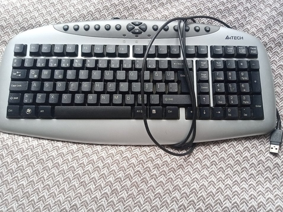 Gri ve siyah tuşlara sahip, üstte medya kontrol düğmeleri ve fonksiyon tuşları bulunan kablolu Türkçe Q klavye. Nümerik tuş takımı mevcuttur.⌨️. sorunsuz çalışıyor. ihtiyaç fazlası