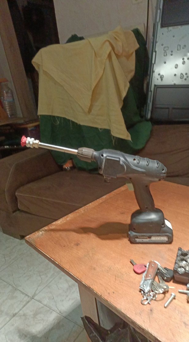 Uzun başlıklı, kullanımı kolay gri kablosuz basınçlı temizleyici. Temizlik işleri için uygun tasarlanmıştır.