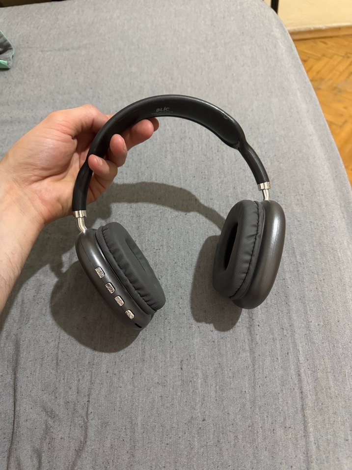 Gri kablosuz kulaklık, rahat kullanım için yastıklı kulak pedleri ve ayarlanabilir kafa bandına sahiptir .