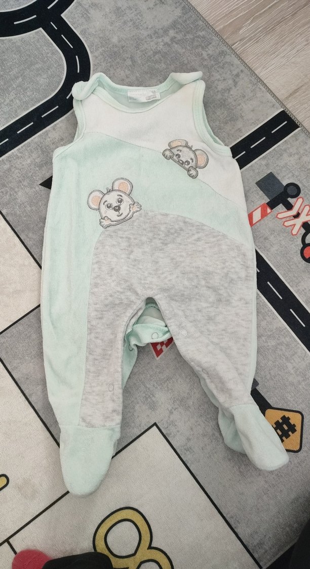 Gri renk, kolsuz, yuvarlak yakalı kadife kumaştan yapılmış, sevimli fare baskılı bebek tulumu. Rahat ve kullanışlıdır. Alman markası carters kalitesinde