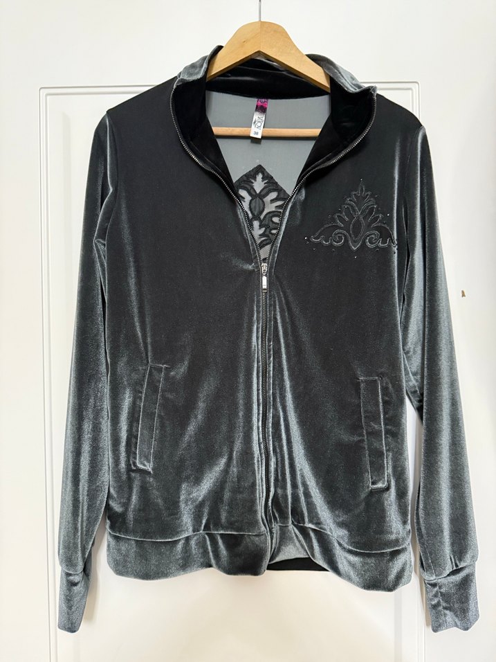 Yumuşak kadife kumaştan yapılmış, yüksek yakalı ve fermuarlı, vücuda oturan gri ceket. Uzun kollu ve göğüste ince nakış detayı bulunur.