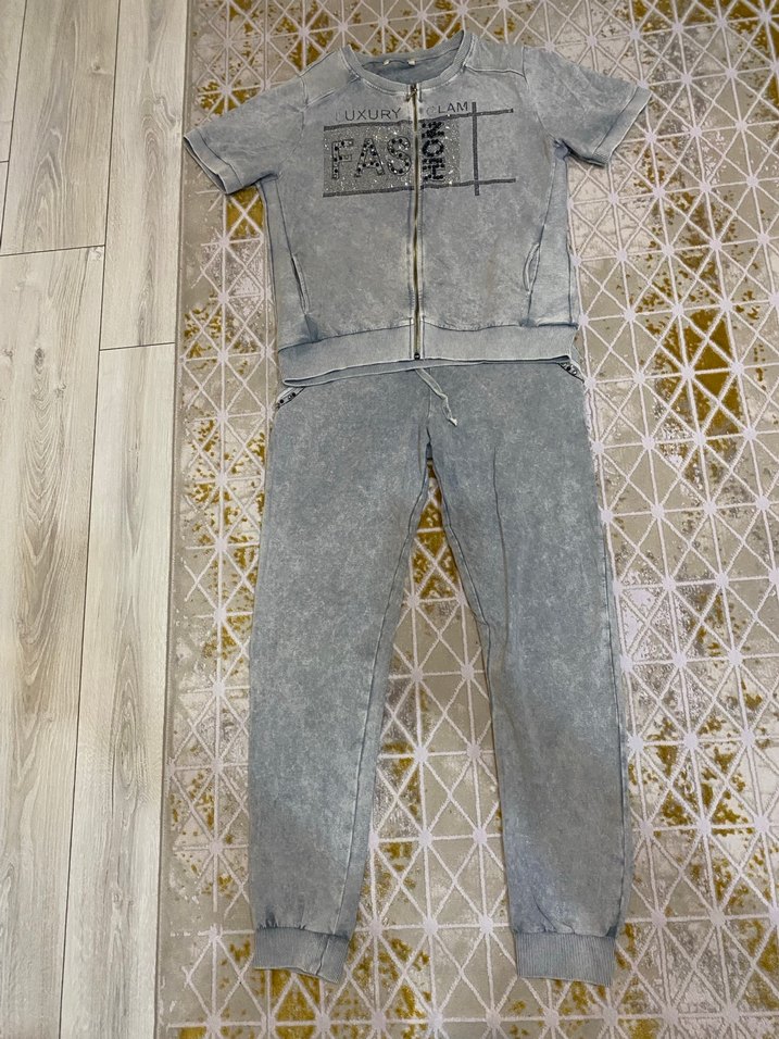Gri kadife kumaştan, bol kesim ve fermuarlı kadın eşofman takımı. Üstte bisiklet yaka, pantolonda rahat manşetler bulunur. Taşlarında hiçbir dökülme vs yoktur hiç kullanılmadı sadece dolapta beklediği için alt kısmının lastiği gevşemiş durumda biraz 2 Xl ama xl ve L beden uyumlu
