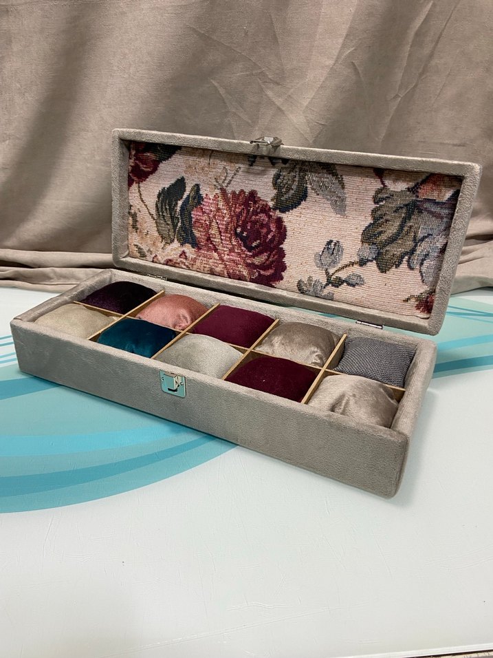 Gri kadife kaplı, iç kısmı çiçek desenli kumaşla kaplı ve çok bölmeli makyaj düzenleyici kutusu.