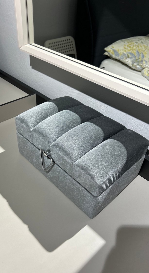 Gri kadife kumaştan yapılmış, yumuşak dolgulu üstü ve metal kilitli makyaj düzenleyici kutu. Çeyiz sadığı