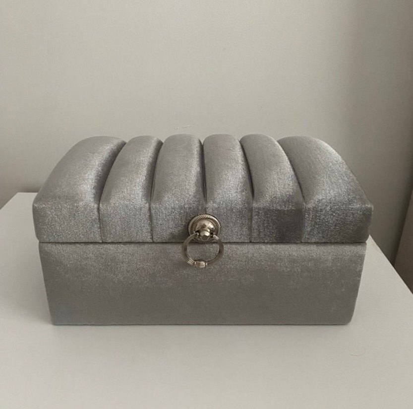 Yumuşak dolgulu üst kısmı ve yuvarlak metal halka kulpu olan gri kadife makyaj organizer kutusu. Makyaj ürünleri için şık bir saklama çözümü sunar.