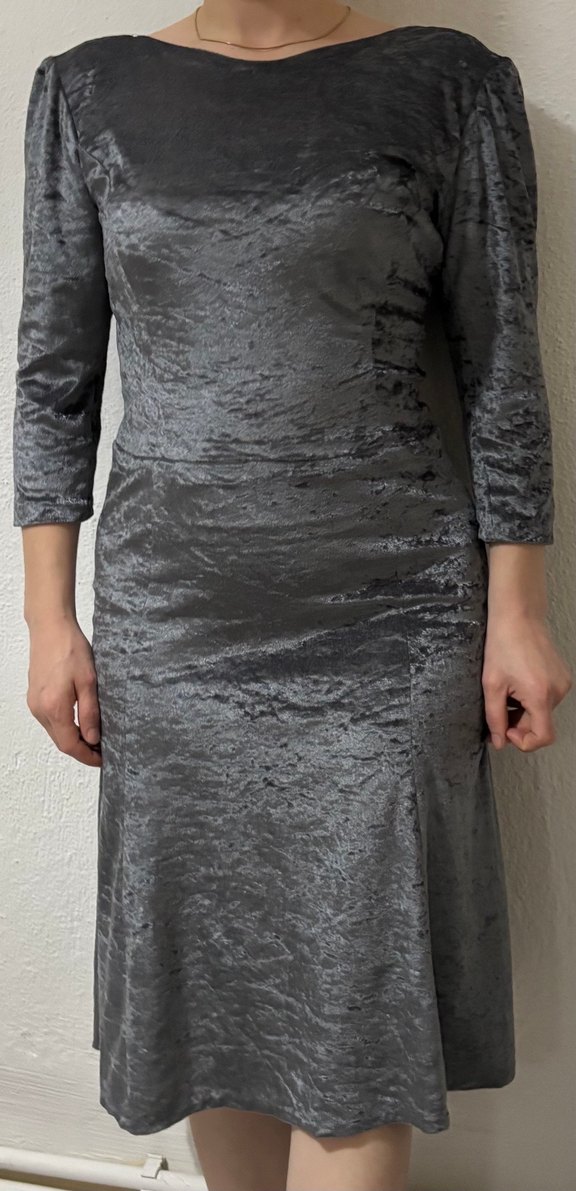 Gri renk,kadife tasarımlı ve kayık yaka detaylı, uzun kollu, vücuda oturan midi elbise. Gotik tarzda romantik akşamlar için uygun.