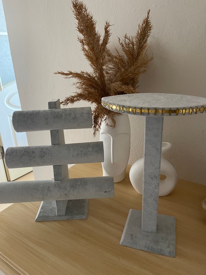 Gri kadife kaplama, üç yatay çubuğa sahip takı standı ve altın detaylı yuvarlak tabaklı dekoratif stand, kare tabanlı.kolye bileklik asmalık mağazamda kullanıyordum fazlalıktan satıyorum 2 Li set