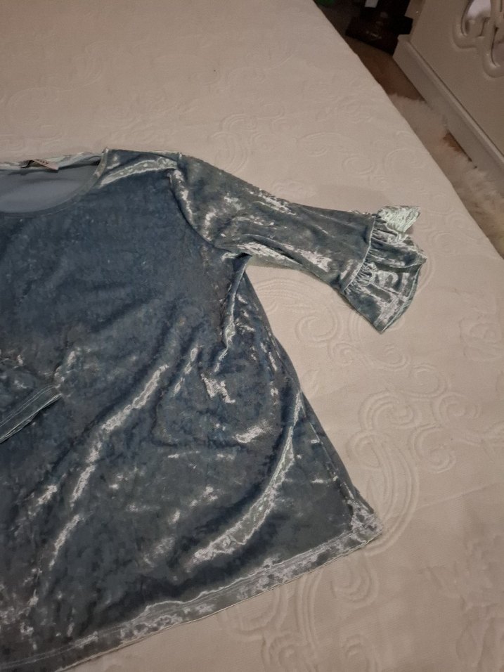 Gri kadife, uzun kollu ve V yaka hamile bluzu. Salaş kesimli, drapeli kollu ve midi boyda, günlük kullanım için uygundur.