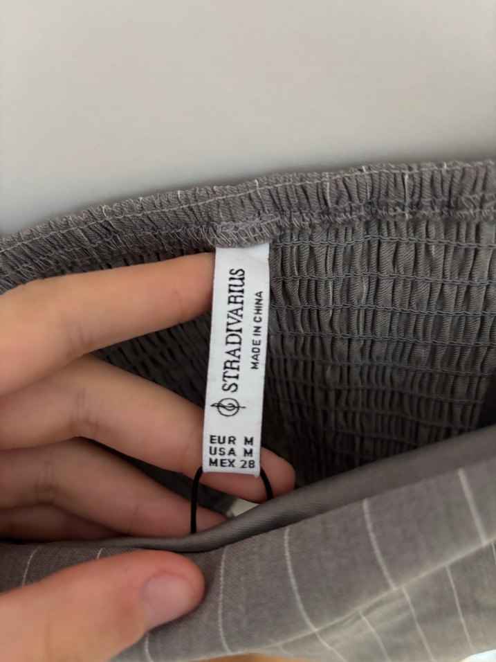Gri renkli kadın crop baskılı desene ve Velcro kapamaya sahiptir. Sokak modası ve Paris tarzını bir araya getirir. Stradivarius markasıdır.