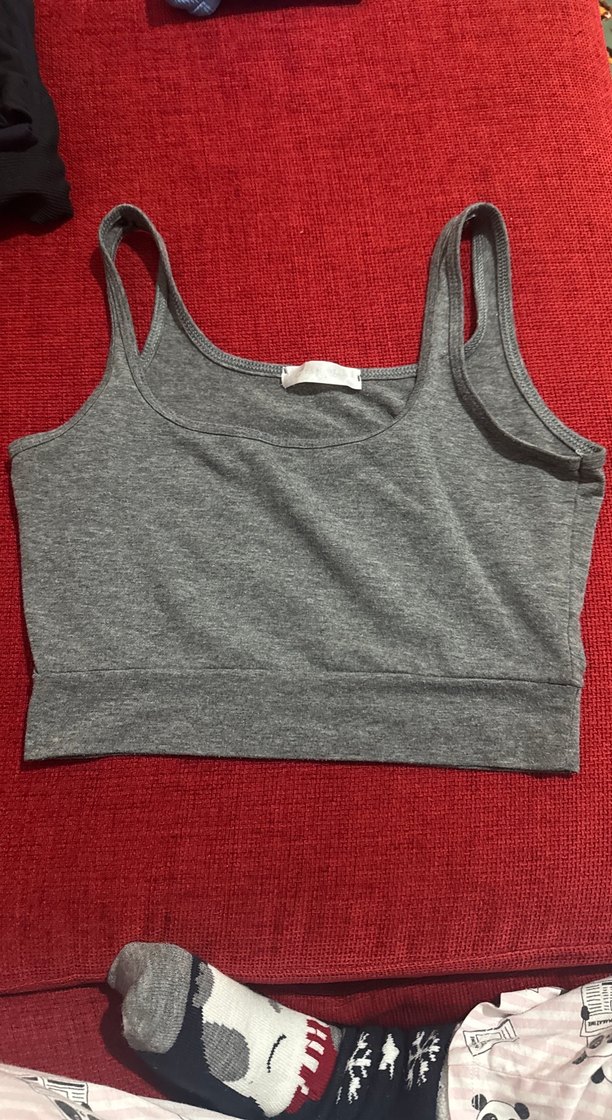Pamuk kumaştan yapılmış, kayık yaka ve kolsuz gri kadın crop top. Spor ve sokak modasına uygun, vücuda oturan midi uzunluğunda.