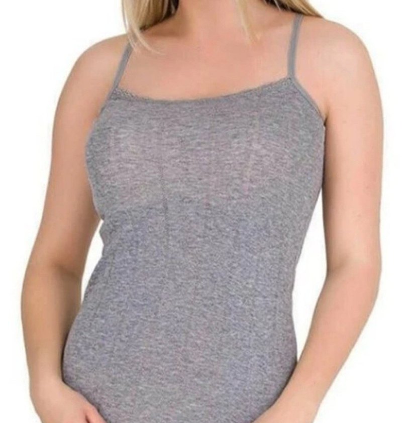 Gri renkli kadın atlet, ince askılı ve normal boyda. Düz tasarımı rahat ve spor şıklığı yansıtır. s m l uyumludur