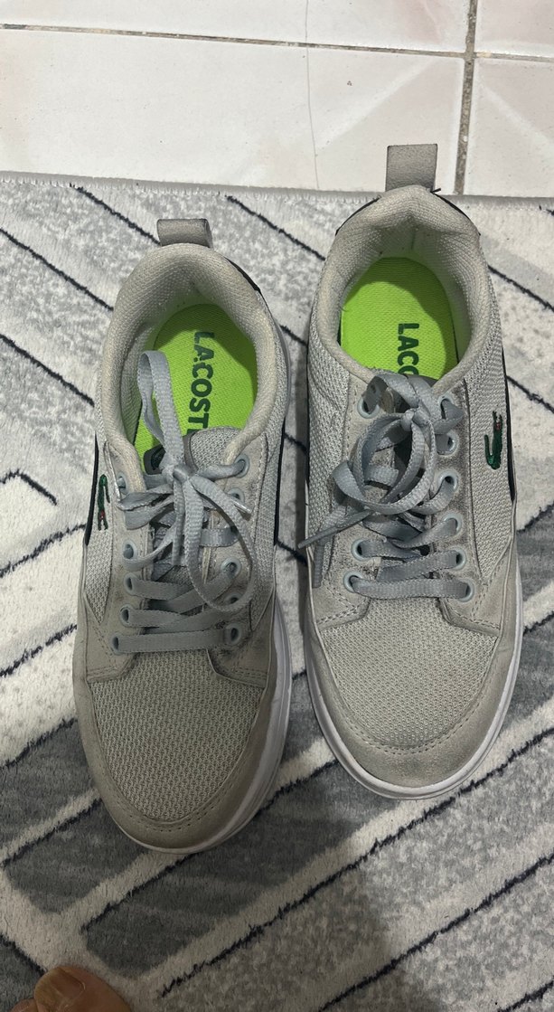 Gri renkli, bağcıklı ve düz tabanlı kadın spor ayakkabısı. Lacoste markasına ait, desen içermeyen sokak tarzı model.
