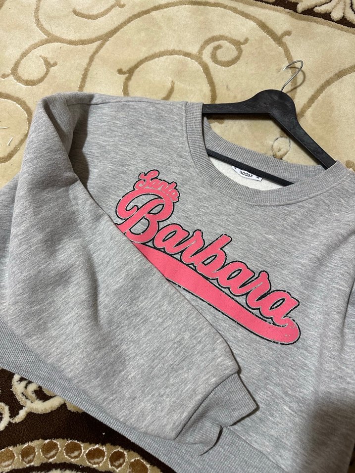 Gri pamuklu sweatshirt, yuvarlak yaka ve uzun kolludur. Bol kesim, örme dokusu ve baskılı 'Barbara' yazısı içerir, günlük sokak stiline uygundur.