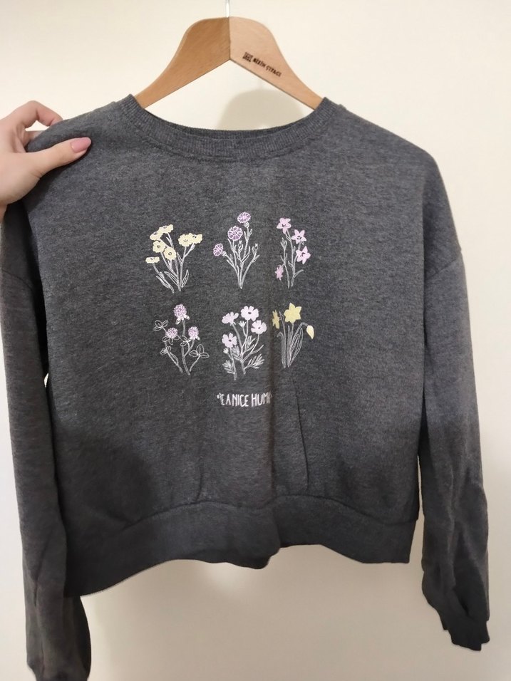 Gri renkli, uzun kollu, yuvarlak yaka ve bol kesime sahip triko sweatshirt. Önünde baskılı çiçek desenleri bulunur, rahat ve günlük kullanıma uygundur.