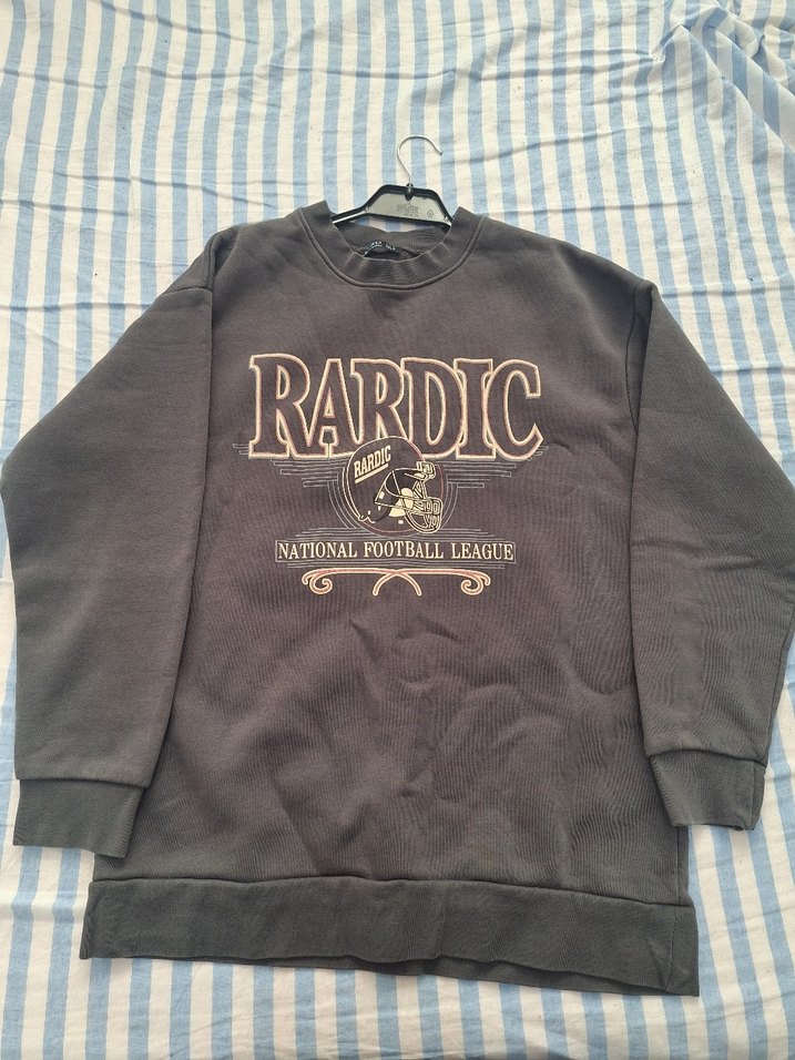 Salaş kesim, uzun kollu, bisiklet yaka gri sweatshirt. Örgü dokusu ve baskılı 'RARDIC NATIONAL FOOTBALL LEAGUE' yazısı bulunur. Rahat ve günlük kullanım için uygun.