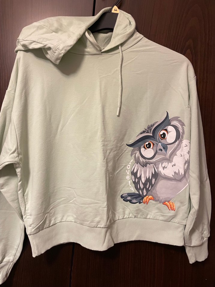 Gri kadın sweatshirt, bisiklet yaka ve uzun kabarık kollara sahip. Rahat kesimi ve önünde baykuş baskısı bulunur, yumuşak sentetik kumaştan yapılmıştır.