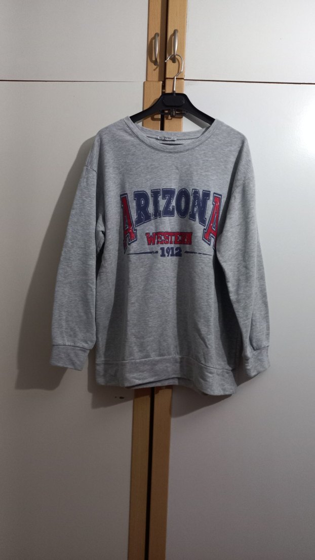 Geso Life marka. Gri renkte, uzun kollu ve yuvarlak yakalı, pamuklu kumaştan üretilmiş bol kesim sweatshirt. 'Arizona 1912 Western' baskısı ile spor ve rahat tarz dır. Boy 70 , iki kol arası 59 cm . etiket bedeni L. ( bedeni uyarsa Bay giyebilir:)