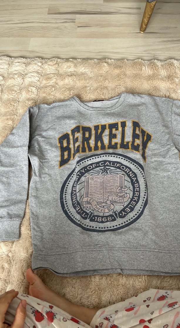 Gri renkli, uzun kollu ve bisiklet yaka, baskılı Berkeley yazılı, yumuşak kürk detaylı bol kesim sweatshirt.